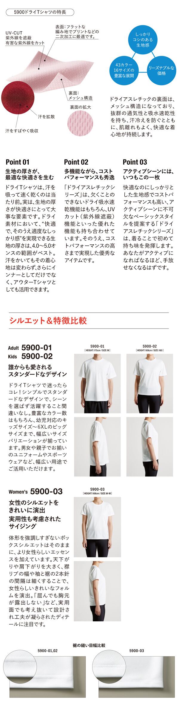 しっかり感があり透けにくくも軽い着心地のベストな生地厚。カラーとサイズの豊富なバリエーション、そして高いコストパフォーマンスを兼ね備えた定番ドライTシャツ